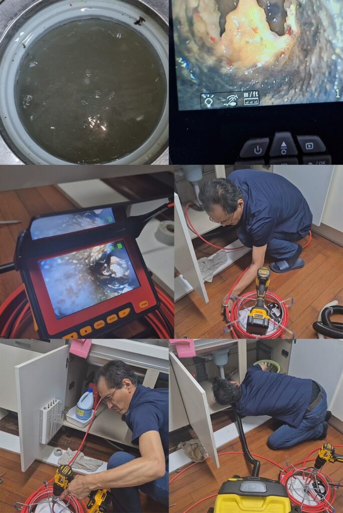 용인 싱크대막힘 작업은 무작정 강한 장비를 사용하는 방식으로 진행하지 않습니다. 먼저 내시경 장비로 배관 내부 상태를 정확히 확인합니다. 막힘 위치와 원인을 확인한 뒤 석션 장비로 1차 이물질을 제거합니다.